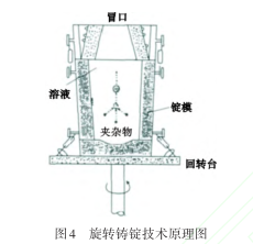 日本住友金属公司开发一种真空感应炉旋转铸锭技术。如图 4所示,其原理是:旋转铸型使液态金属和夹杂物一起做旋转运动,密度大的液态金属向外运动,而密度小的夹杂物向里运动,从而使夹杂物向铸锭中心聚集、变大并快速上浮,实现液态金属和夹杂物的分离。上浮的夹杂物往往在冒口被捕捉,最后切割冒口将夹杂物从合金中除去。为防止旋转铸锭产生环状偏析,确定合适的旋转速度和旋转时间,并在铸锭后期如何减速旋转,直至铸锭完全凝固是关键,这样可以得到完全没有环状偏析的铸锭。